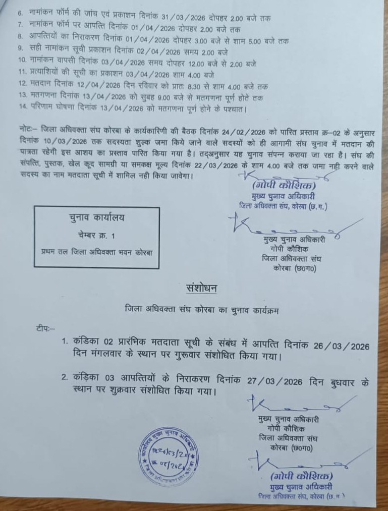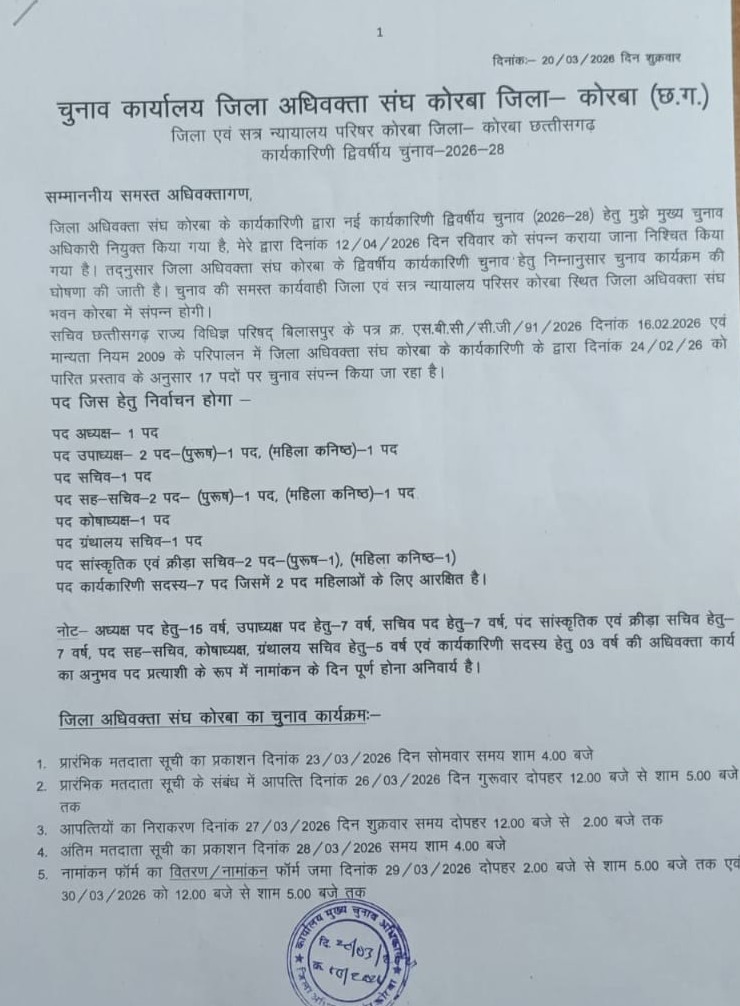 कोरबा। जिला अधिवक्ता संघ कोरबा की नई कार्यकारिणी (सत्र 2026-28) के लिए द्विवार्षिक चुनाव की औपचारिक घोषणा कर दी गई है। मुख्य चुनाव अधिकारी गोपी कौशिक ने चुनाव कार्यक्रम जारी करते हुए बताया कि आगामी 12 अप्रैल 2026 को जिला न्यायालय परिसर स्थित अधिवक्ता संघ भवन में मतदान संपन्न होगा। इस बार कुल 17 विभिन्न पदों पर निर्वाचन किया जा रहा है।