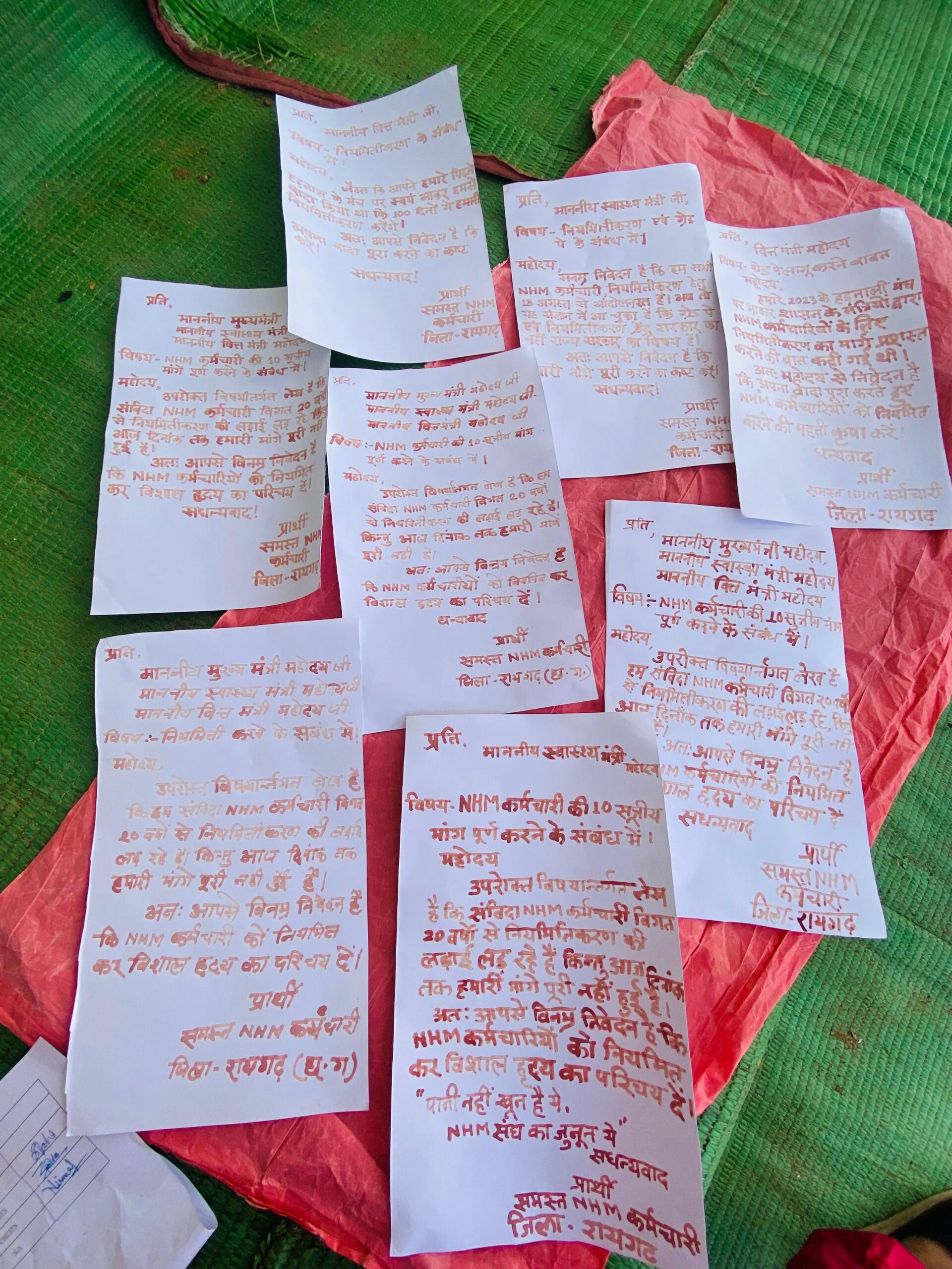 हड़ताली कर्मियों ने मुख्यमंत्री, स्वास्थ्य मंत्री और वित्त मंत्री को अपने खून से लिखा पत्र भेजकर अपनी मांगों को दोहराया है। इस प्रतीकात्मक विरोध के जरिए उन्होंने यह संदेश दिया है कि उनकी मांगे पूरी न होने से वे कितने आहत हैं। कर्मचारियों का कहना है कि यह केवल पानी नहीं, बल्कि उनका जुनून और समर्पण है, जो खून के रूप में बाहर आ रहा है। यह प्रदर्शन सरकार पर एक तीखा तंज है, जिसमें वे अपनी अधूरी मांगों को लेकर अपनी पीड़ा और आक्रोश व्यक्त कर रहे हैं।