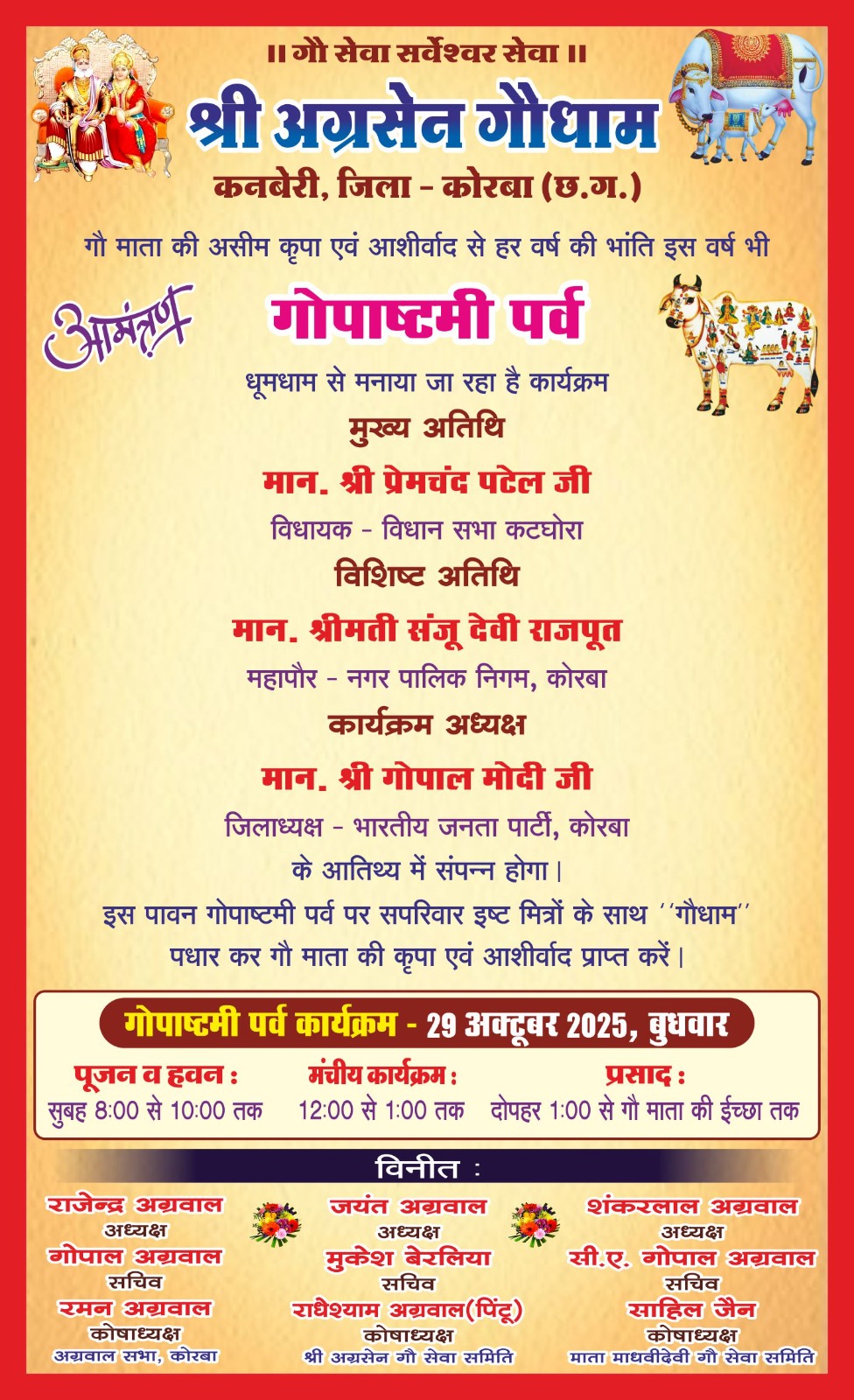 कोरबा (छत्तीसगढ़)। गौ माता की असीम कृपा और आशीर्वाद प्राप्त करने के उद्देश्य से कनबेरी, जिला-कोरबा (छ.ग.) स्थित श्री अग्रसेन गौधाम में इस वर्ष भी गोपाष्टमी पर्व का आयोजन की तैयारी जोर शोर से चल रही है। यह पर्व 29 अक्टूबर 2025, बुधवार को मनाया जाएगा।
