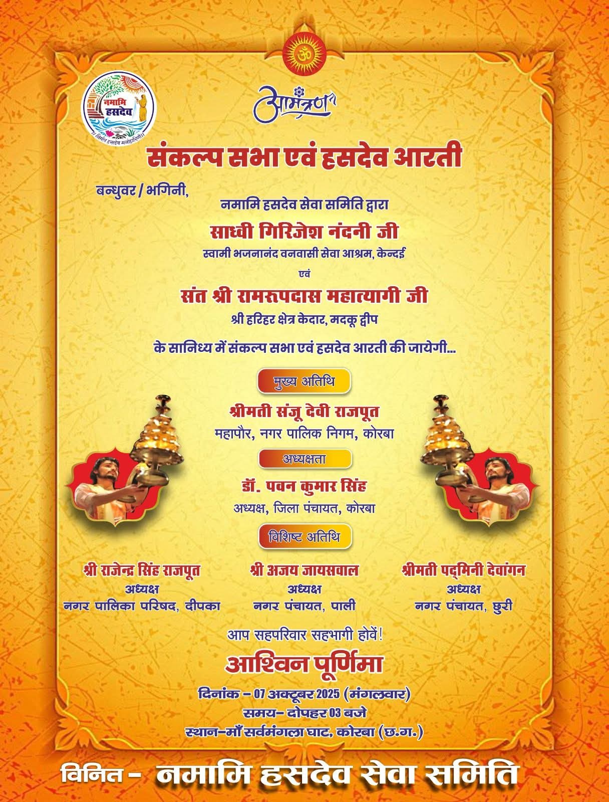 कोरबा: धर्म और अध्यात्म के संगम को समर्पित ‘संकल्प सभा एवं हसदेव आरती’ का भव्य आयोजन कोरबा में अश्विन पूर्णिमा के पावन अवसर पर किया जा रहा है। यह आयोजन 07 अक्टूबर 2025 (मंगलवार) को दोपहर 03 बजे सर्वमंगला घाट, कोरबा में होगा।