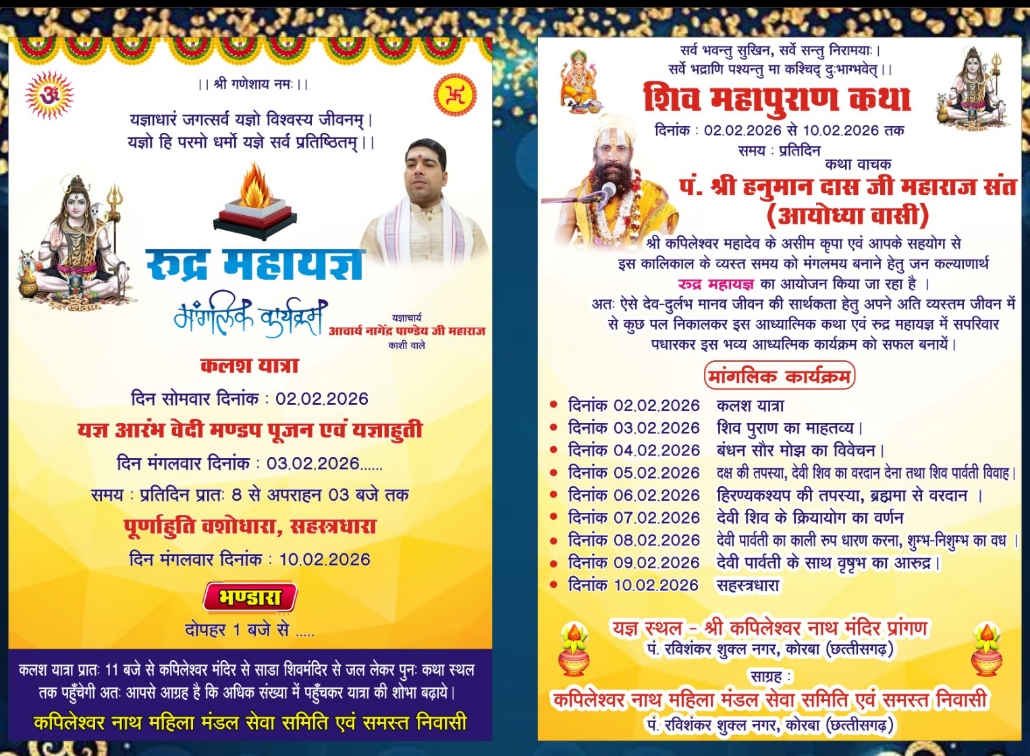 कोरबा। पं. रविशंकर शुक्ल नगर स्थित श्री कपिलेश्वर नाथ मंदिर प्रांगण में जन-कल्याण और आध्यात्मिक चेतना के प्रसार हेतु रुद्र महायज्ञ एवं शिव महापुराण कथा का भव्य आयोजन होने जा रहा है। कपिलेश्वर नाथ महिला मंडल सेवा समिति के तत्वावधान में आयोजित यह धार्मिक अनुष्ठान 02 फरवरी से 10 फरवरी 2026 तक संपन्न होगा।
