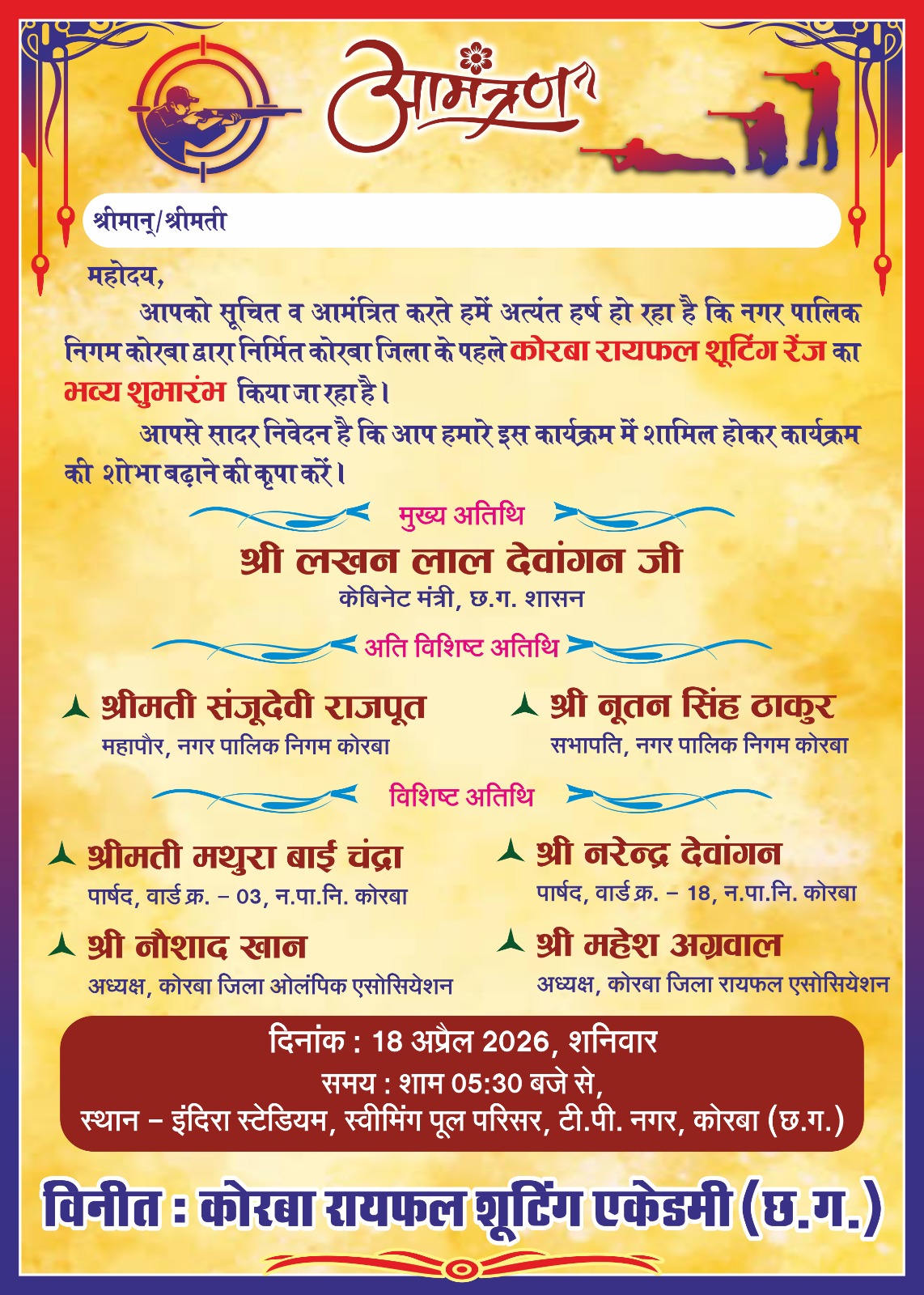 कोरबा। औद्योगिक नगरी कोरबा के खेल जगत में शनिवार को एक नया स्वर्णिम अध्याय जुड़ने जा रहा है। नगर पालिक निगम कोरबा की अभिनव पहल से इंदिरा गांधी स्टेडियम परिसर में नवनिर्मित ‘कोरबा रायफल शूटिंग एकेडमी’ का भव्य शुभारंभ कल शनिवार, शाम 5:30 बजे होने जा रहा है। इस आधुनिक शूटिंग रेंज का उद्घाटन प्रदेश के कैबिनेट मंत्री श्री लखनलाल देवांगन एवं महापौर श्रीमती संजू देवी राजपूत के हाथों संपन्न होगा।