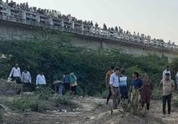 फोटो: नवजात बच्ची का शव ढूंढने जब पुलिस बनास नदी के तट पर पहुंची तो लोग ब्रिज पर उमड़ पड़े