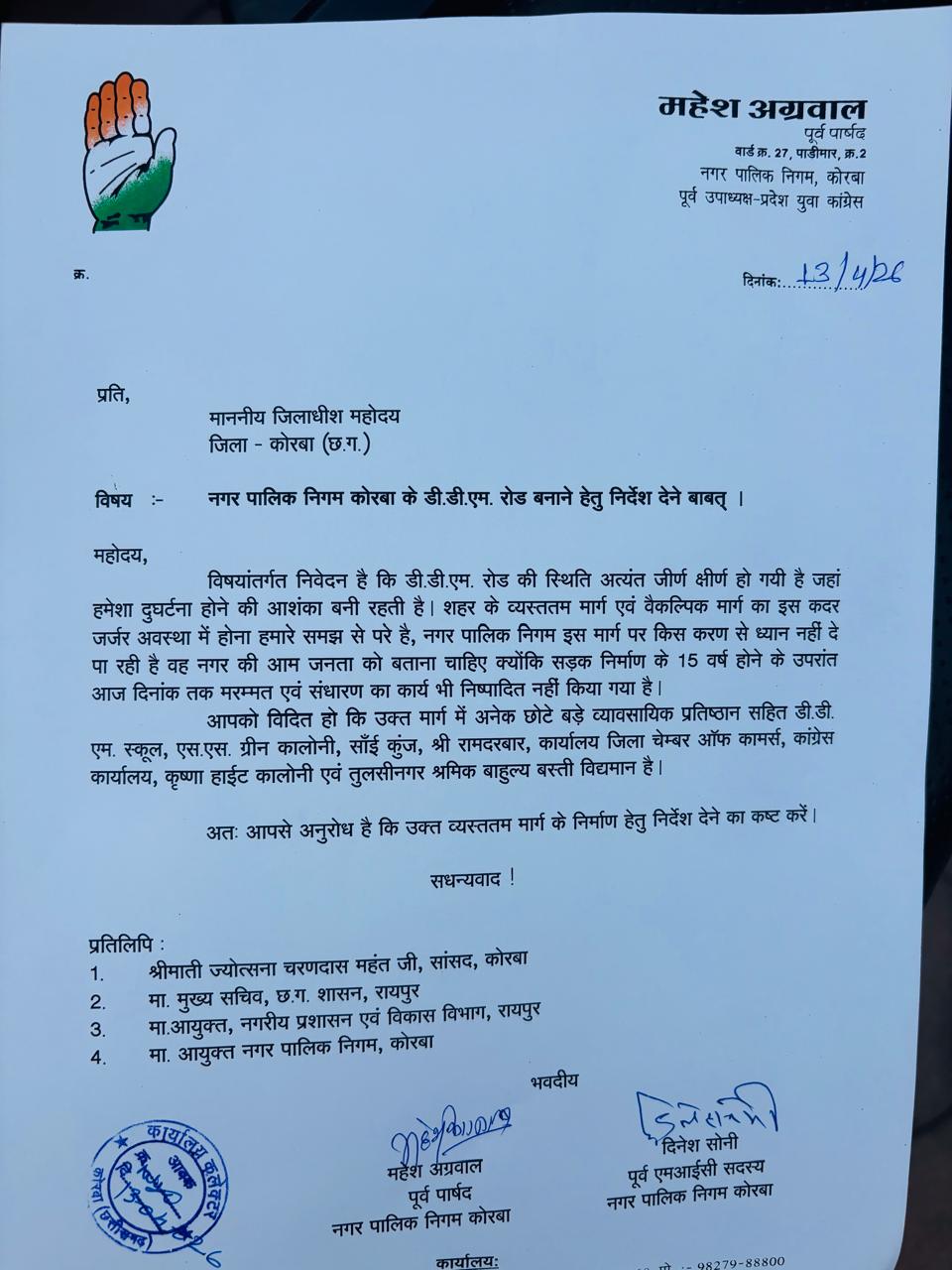 कोरबा। नगर पालिक निगम कोरबा के व्यस्ततम डी.डी.एम. स्कूल मार्ग की बदहाली को दूर करने के लिए पूर्व पार्षदों ने मोर्चा खोल दिया है। पूर्व पार्षद महेश अग्रवाल एवं पूर्व एमआईसी सदस्य दिनेश सोनी की मांग पर कोरबा सांसद श्रीमती ज्योत्स्ना चरणदास महंत ने गंभीरता दिखाते हुए जिला कलेक्टर को पत्र लिखा है। सांसद ने इस मार्ग के निर्माण हेतु खनिज न्यास मद (डीएमएफ) से राशि आवंटित कर उच्च प्राथमिकता के आधार पर कार्य स्वीकृत करने का निवेदन किया हैं।