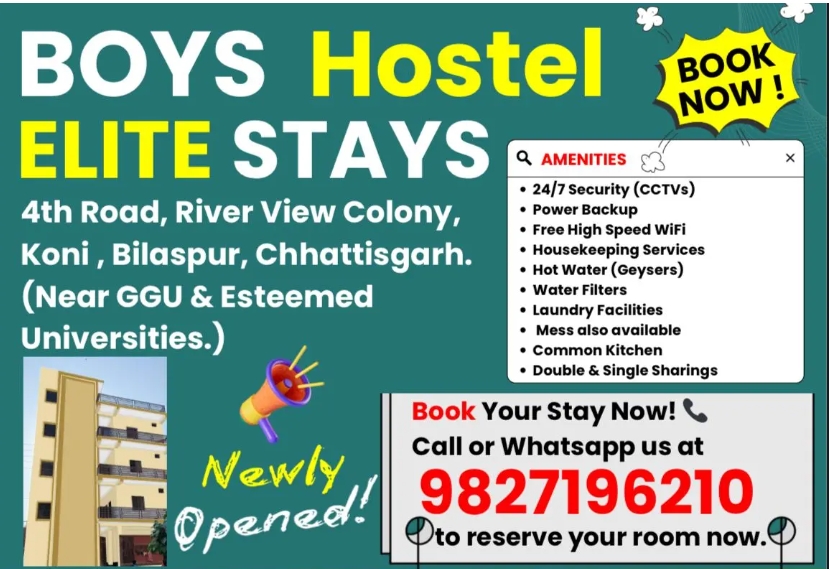 बॉयज़ हॉस्टल “एलीट स्टे।” ने बिलासपुर में उच्च शिक्षा प्राप्त करने वाले छात्रों के लिए एक सुरक्षित, आरामदायक और सुविधा संपन्न वातावरण प्रदान करने का वादा किया है। इच्छुक छात्र अपने कमरे आरक्षित करने के लिए 9827196210 पर कॉल या व्हाट्सएप कर सकते हैं।