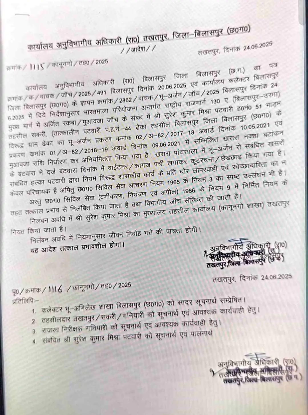 सुरेश कुमार मिश्रा, जो तखतपुर क्षेत्र में पटवारी के रूप में कार्यरत थे, को भारतमाला परियोजना के तहत बिलासपुर-उरगा राष्ट्रीय राजमार्ग (NH-130A) के लिए ग्राम ढेका में भूमि अधिग्रहण में अनियमितता के आरोप में 24 जून 2025 को निलंबित किया गया था। जिला स्तरीय जांच समिति की रिपोर्ट के अनुसार, मिश्रा और तत्कालीन तहसीलदार डीएस उइके ने फर्जी दस्तावेज तैयार कर मुआवजा वितरण में गड़बड़ी की, जिससे शासन को करोड़ों रुपये की आर्थिक क्षति हुई। नायब तहसीलदार की शिकायत पर तोरवा पुलिस ने दोनों के खिलाफ FIR दर्ज की थी।आत्महत्या और सुसाइड नोट27 जून 2025 को मिश्रा ने अपनी बहन के फार्महाउस में फांसी लगाकर आत्महत्या कर ली। उनके पास से मिले सुसाइड नोट में उन्होंने लिखा कि वे इस मामले में निर्दोष हैं और निलंबन के कारण मानसिक तनाव में थे। उन्हें अधिकारियों ने फसाया है।यह उनका पिछले छह महीनों में दूसरा निलंबन था, जिसने उनके तनाव को और बढ़ा दिया।वे अगले कुछ दिन में रिटायर होने वाले थे। पुलिस ने शव को पोस्टमॉर्टम के लिए भेज दिया और मामले की जांच शुरू कर दी है।