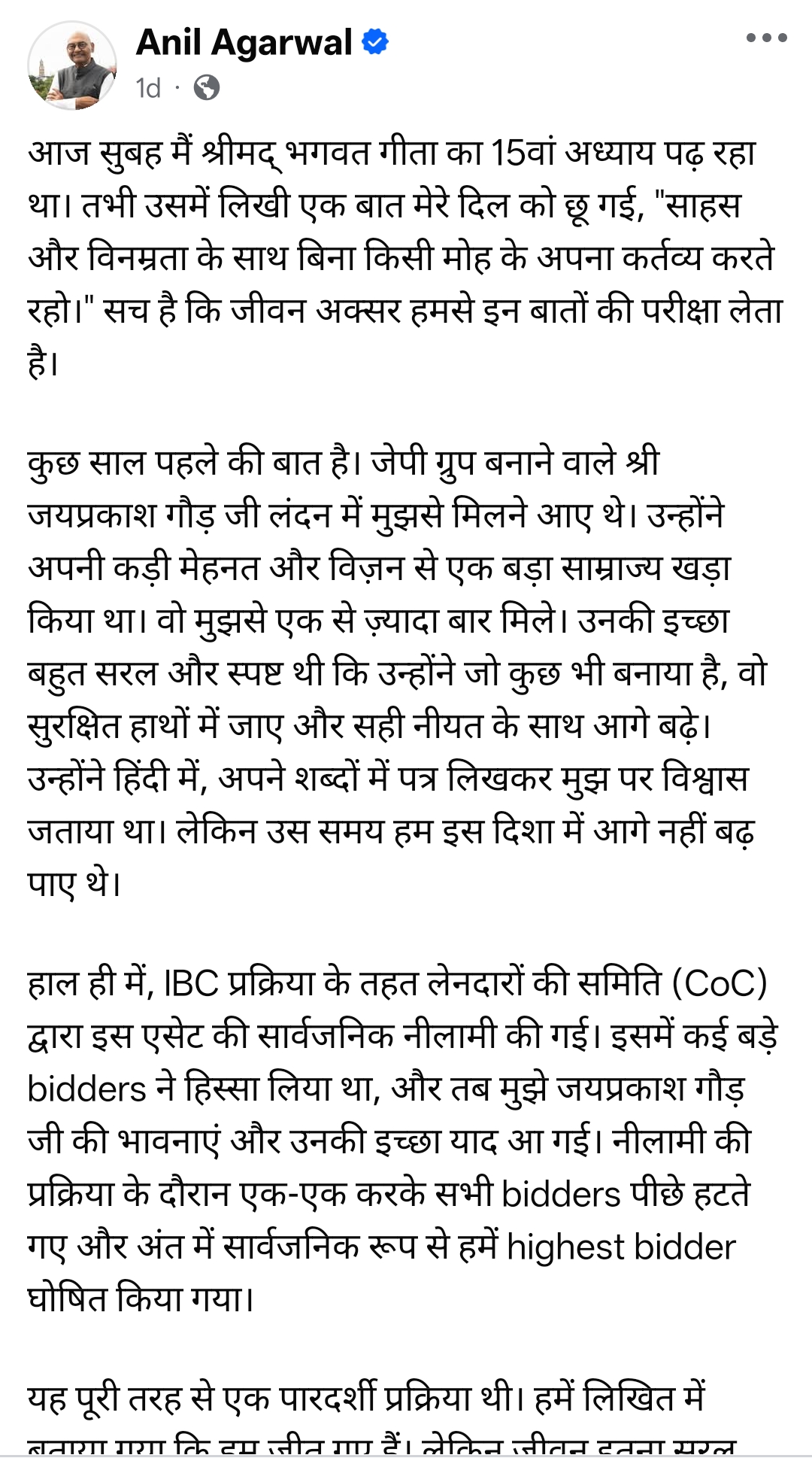 वेदांता के चेयरमैन अनिल अग्रवाल ने सोशल मीडिया पर अपनी नाराजगी जाहिर करते हुए लिखा कि उन्हें पहले ‘हाईएस्ट बिडर’ घोषित कर लिखित जानकारी दी गई थी, लेकिन बाद में फैसला बदल दिया गया। उन्होंने भगवद गीता के संदेश का उल्लेख करते हुए संकेत दिया कि वे अपने अधिकारों और ‘वैल्यू मैक्सिमाइजेशन’ के सिद्धांत के लिए यह कानूनी लड़ाई लड़ेंगे।