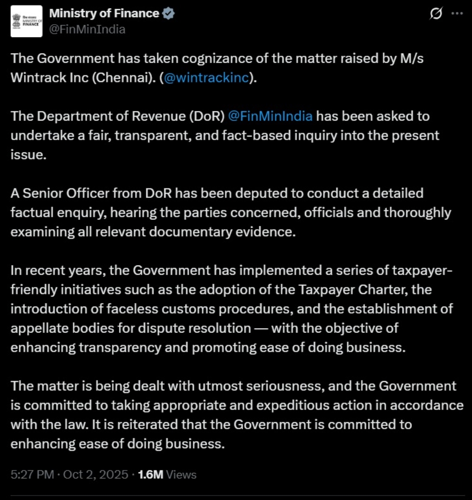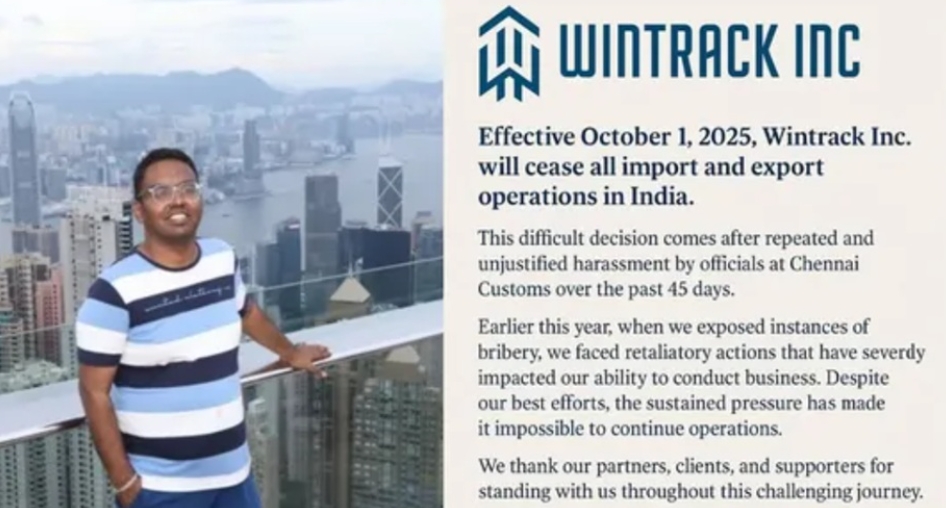 लॉजिस्टिक फर्म विन्ट्रैक इंक ने 1 अक्टूबर को एक सार्वजनिक पोस्ट में चेन्नई कस्टम विभाग के कुछ अधिकारियों पर गंभीर आरोप लगाए। कंपनी का कहना है कि अधिकारी उनसे बार-बार रिश्वत मांग रहे थे और जानबूझकर उनके शिपमेंट में देरी कर रहे थे।