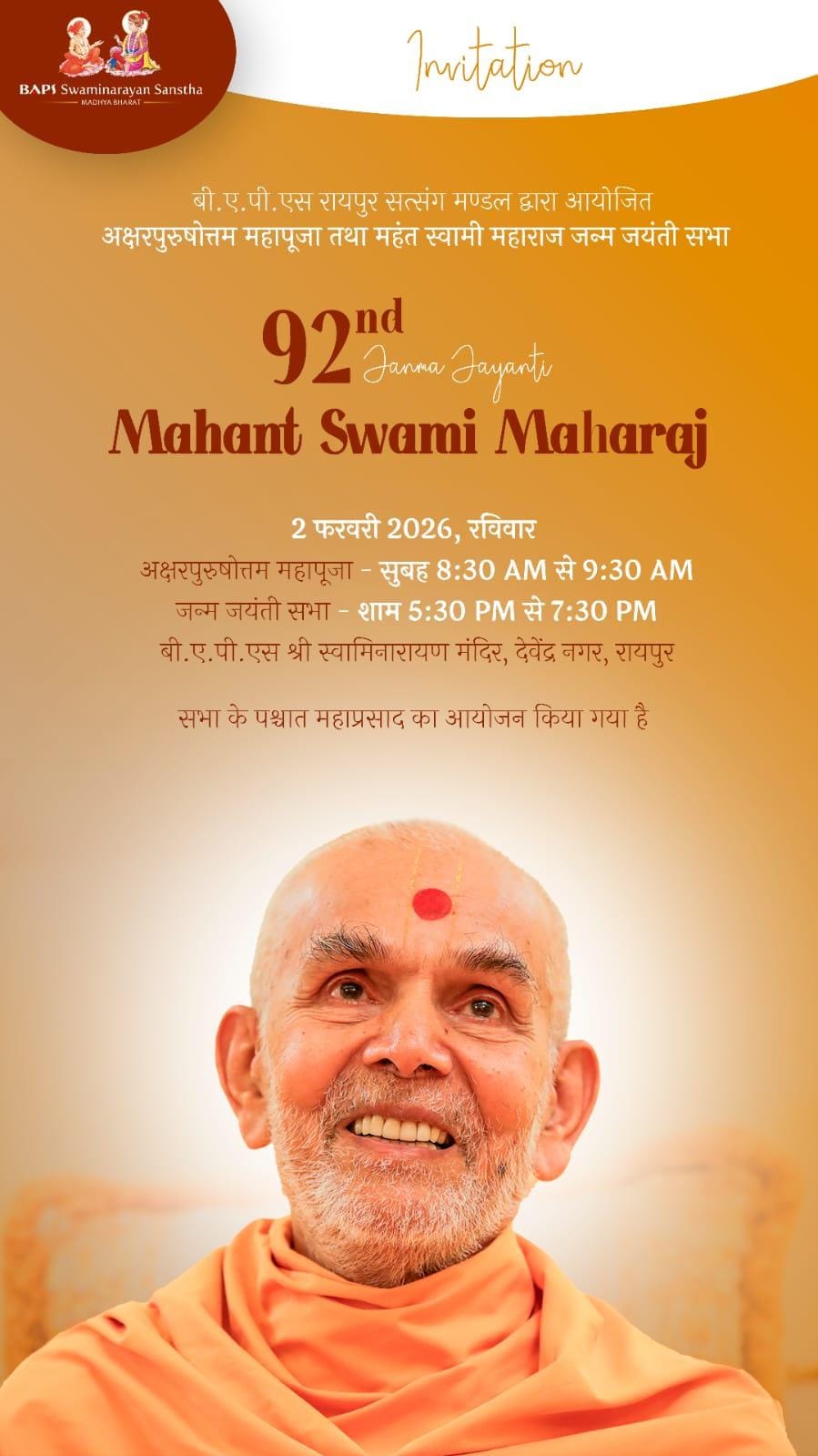 रायपुर। राजधानी के देवेंद्र नगर स्थित श्री स्वामीनारायण मंदिर में रविवार, 1 फरवरी को भक्ति और उत्साह का संगम देखने को मिलेगा। BAPS रायपुर सत्संग मंडल द्वारा परम पूज्य महंत स्वामी महाराज के 92वें जन्म जयंती महोत्सव एवं माघी पूर्णिमा के पावन अवसर पर भव्य महापूजा और विशेष सभा का आयोजन किया गया है।