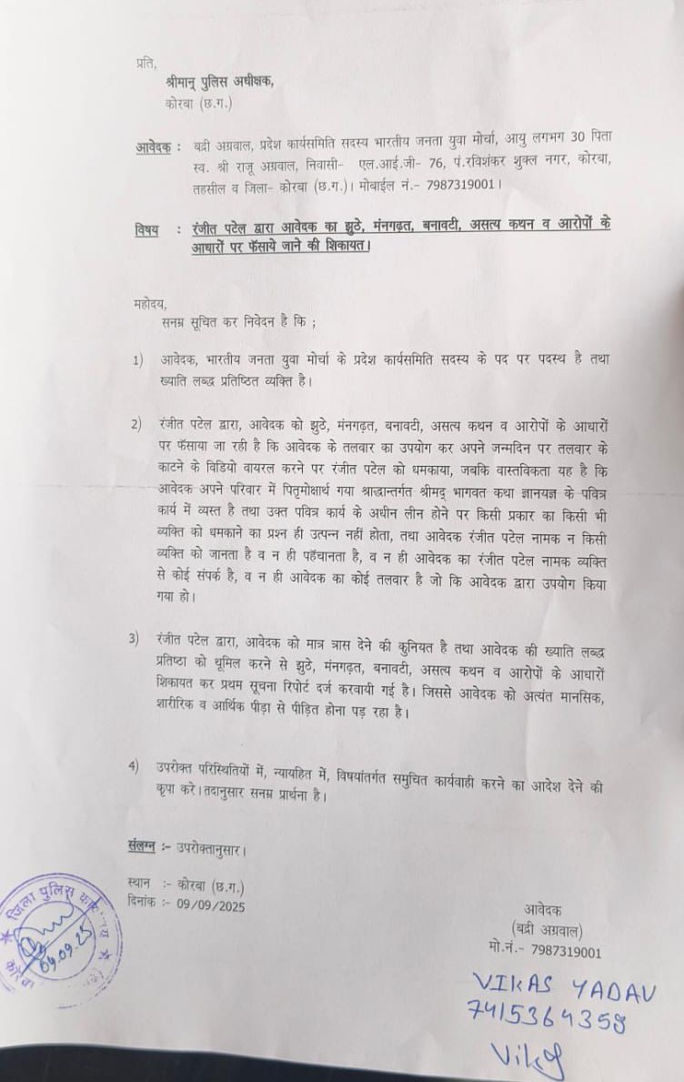 बद्री अग्रवाल ने कोरबा एसपी से इस मामले की लिखित शिकायत की है।यह शिकायत पत्र किसी विशाल यादव के माध्यम से जिला पुलिस कार्यालय में दिया है।जिसने कहा गया है कि रंजीत पटेल द्वारा दर्ज कराई गई यह मनगढ़ंत एफआईआर उनकी प्रतिष्ठा को नुकसान पहुँचाने के लिए है। अग्रवाल के अनुसार, वे इस समय बिहार के गया में अपने पितृमोक्ष के कार्य के लिए गए हुए हैं, ऐसे में रंजीत पटेल को धमकाने का सवाल ही पैदा नहीं होता। उन्होंने इस झूठे आरोप से मानसिक और शारीरिक रूप से परेशान होने की बात कहते हुए न्याय की मांग की है।