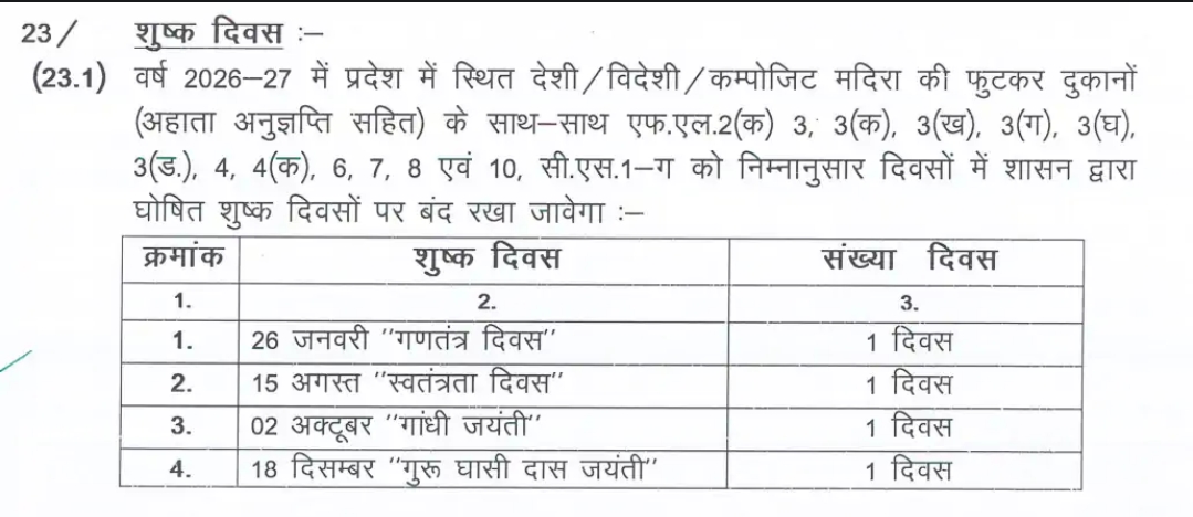 00 अब होली, मुहर्रम और बापू के निर्वाण दिवस पर भी मिलेगी शराब; साय सरकार की नई आबकारी नीति ने शराब प्रेमियों की ‘बल्ले-बल्ले’ की