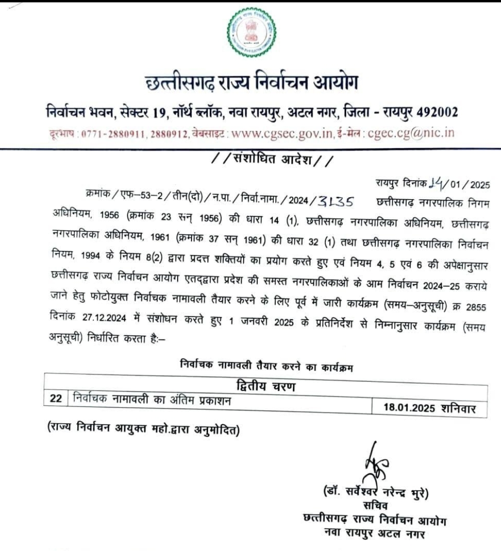 रायपुर।छत्तीसगढ़ में नगरीय निकाय और पंचायत चुनाव को लेकर राज्य चुनाव आयोग ने मतदाता सूची के अंतिम प्रकाशन की तारीख में बदलाव कर दिया है।